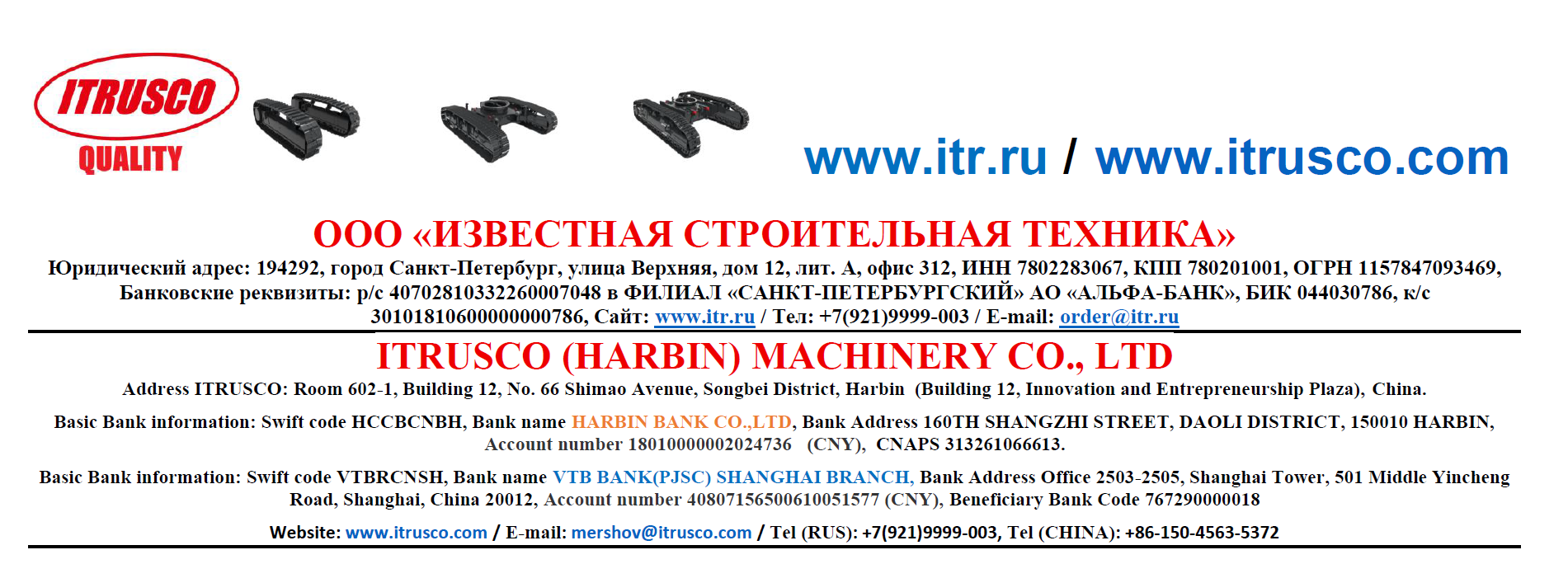 Примечание: 1. Указанные шасси являются оригинальными производства Итальянского завода. 2. Гарантия: 1 год. 3. Цены выставляем за единицу в CNY на условиях Китай (EXW г. Харбин) или в USD с НДС 22% на условиях Россия (DDP г. Владивосток, г. Благовещенск). 4. Указанные выше шасси должны (могут) быть заказаны на основании чертежей, подтвержденных заказчиком. 5. Условия оплаты: первый аванс 40% запуск производства, второй аванс 60% выпуск производства. 6. Можем предоставить договор поставки в USD (оплата рублями) от нашей Российской компанией ООО «ИСТ», на условиях доставки товара DDP, Россия, г. Владивосток, г. Благовещенск. 7. Можем предоставить прямой контракт в CNY (оплата юанями на ВТБ ШАНХАЙ) от нашей компании ITRUSCO (HARBIN) MACHINERY CO., LTD, на условиях доставки товара EXW г. Харбин.